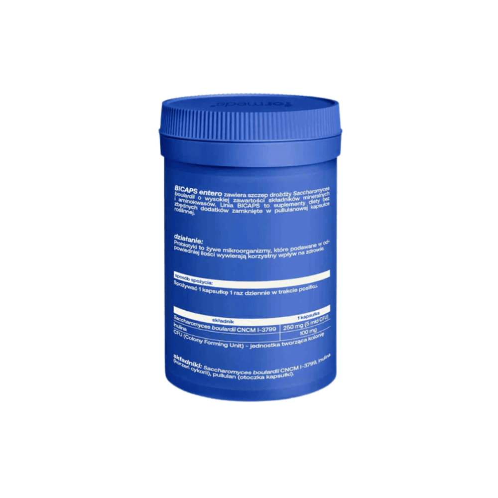 Wysokiej jakości Saccharomyces boulardii 6 mld CFU w suplemencie BICAPS Entero Formeds. Ponieważ jest to sprawdzony szczep drożdży probiotycznych, skutecznie wspiera równowagę mikroflory jelitowej, szczególnie podczas antybiotykoterapii. Co więcej, pomaga w łagodzeniu biegunek. Dzięki temu chroni Twój układ pokarmowy. Formuła „Czysty Skład” z inuliną (150 mg) jest w 100% wegańska. Zamów teraz – gwarantujemy wysyłkę w 24h!