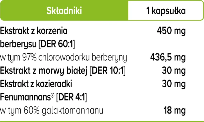 Ekstrakt z korzenia berberysu (standaryzowany na 97% chlorowodorku berberyny) – wspiera metabolizm glukozy, poziom lipidów, zdrowie układu krążenia, wątroby i skóry. Jest to esencja, jeśli szukasz berberyny na cukier.