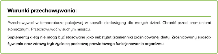 Nie należy przekraczać zalecanej porcji do spożycia w ciągu dnia. Produkt nie może być stosowany jako substytut zróżnicowanej diety. Zaleca się stosowanie zróżnicowanej i zrównoważonej diety i zdrowego trybu życia.