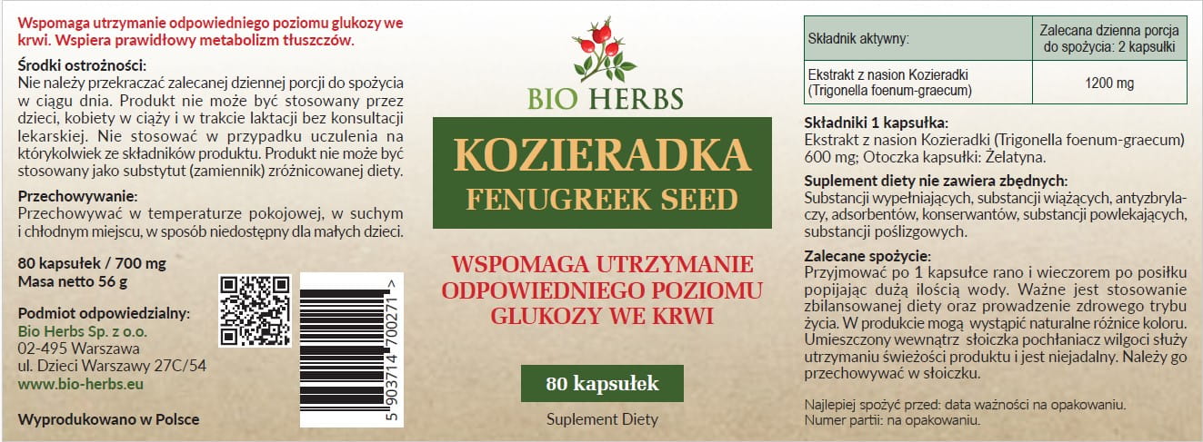 Ekstrakt z nasion Kozieradki (Trigonella foenum-graecum) 600mg; Otoczka kapsułki: Celuloza roślinna.